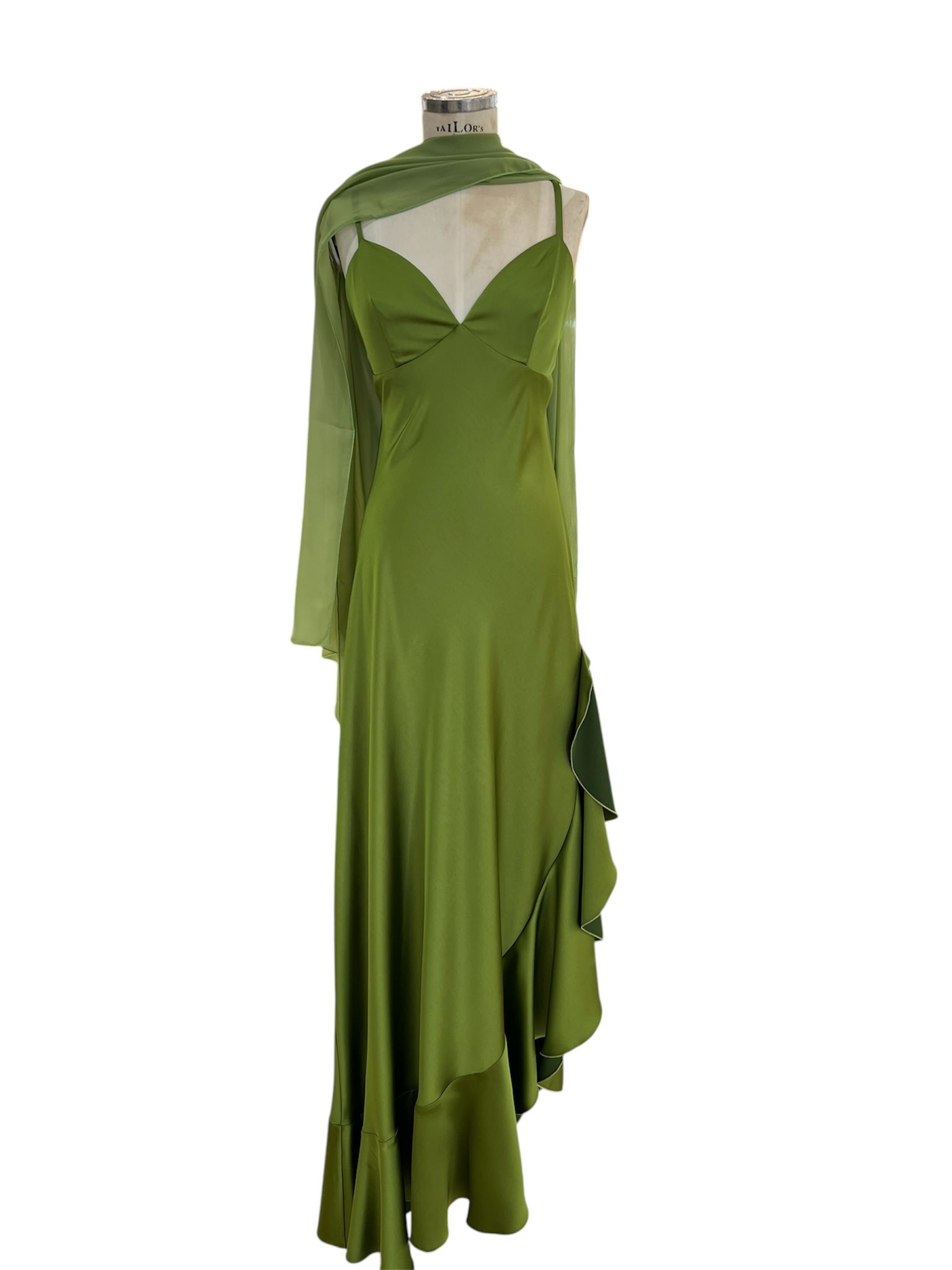 ABITO IN SATEN E ROUCHES SU SPACCO CON STOLA