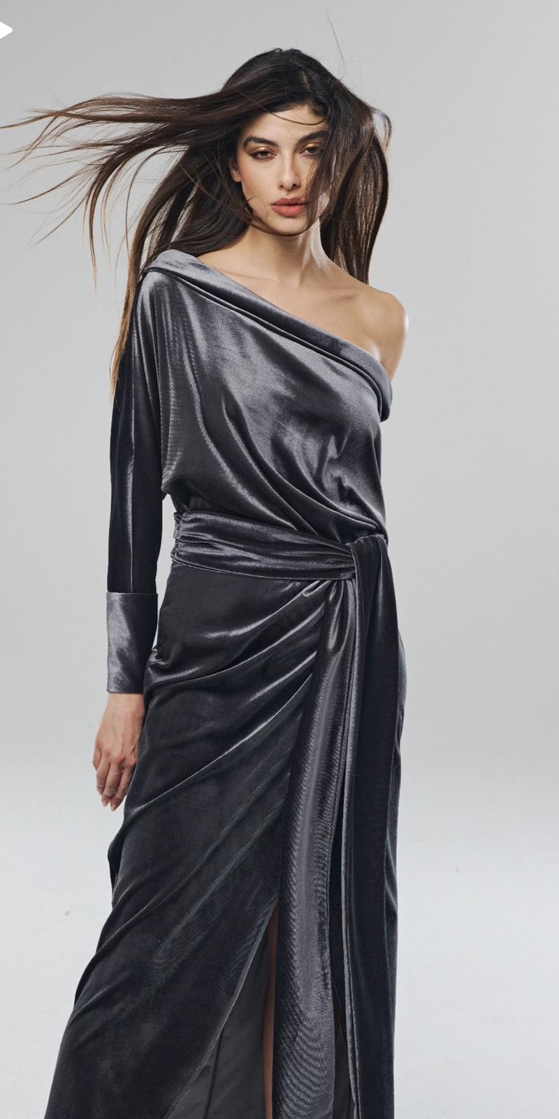 ABITO IN VELLUTO SCOLLO A BARCA CON AGGRAPPATURA IN VITA