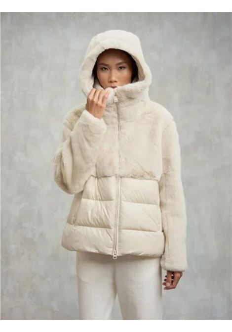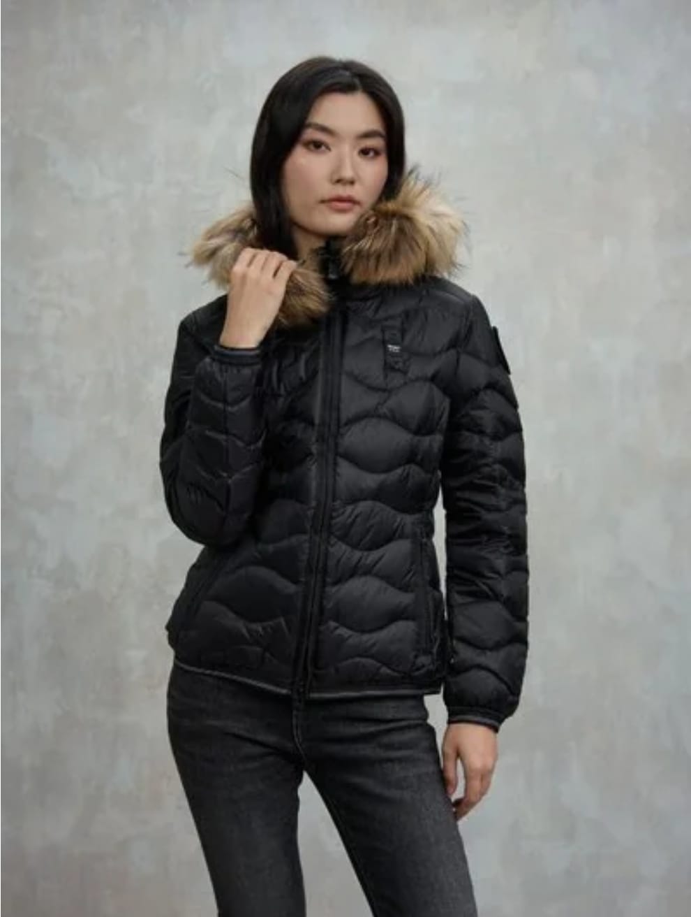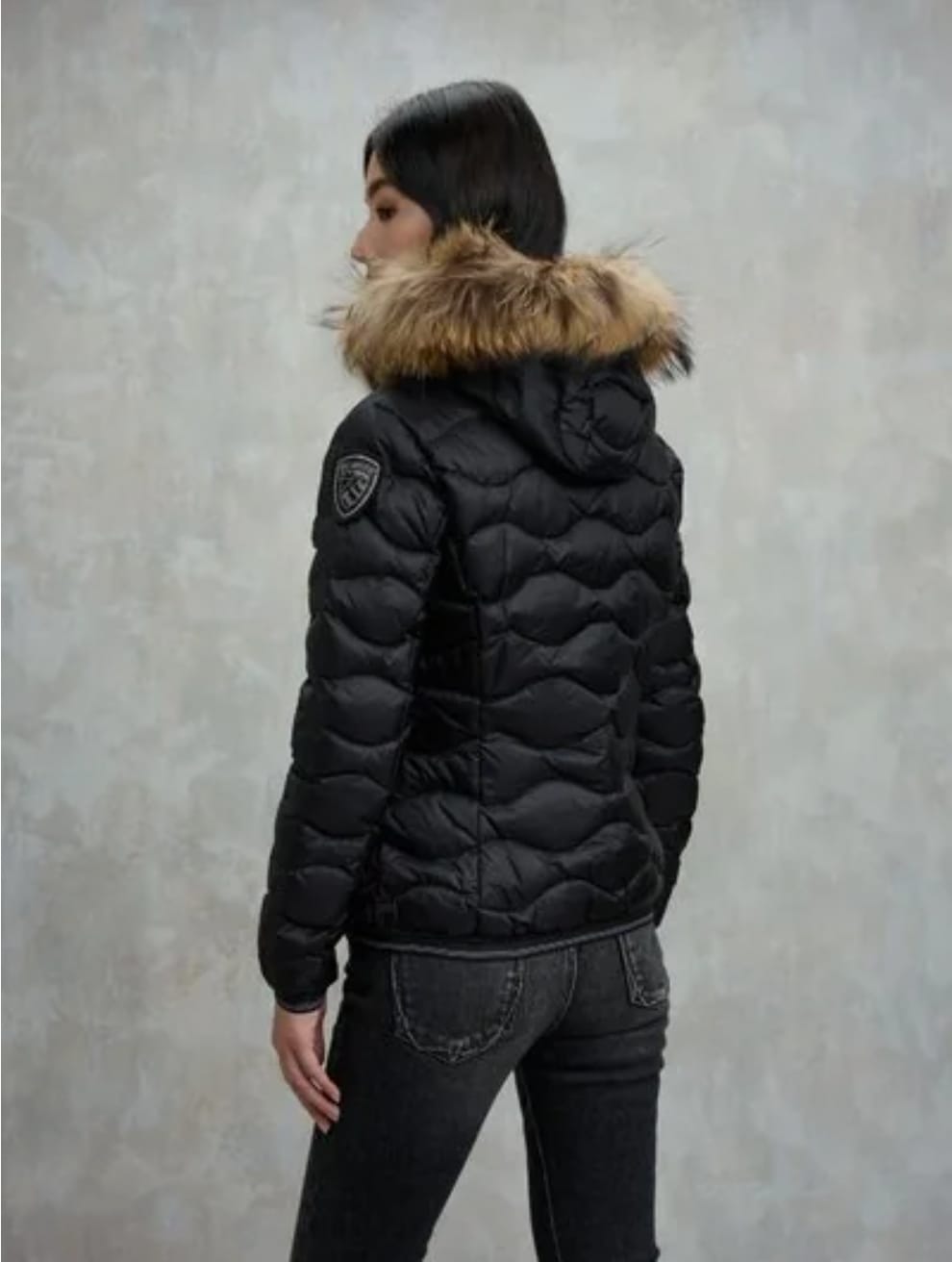PIUMINO CORTO TRAPUNTATO A ONDA CON CAPPUCCIO E PELLICCIA