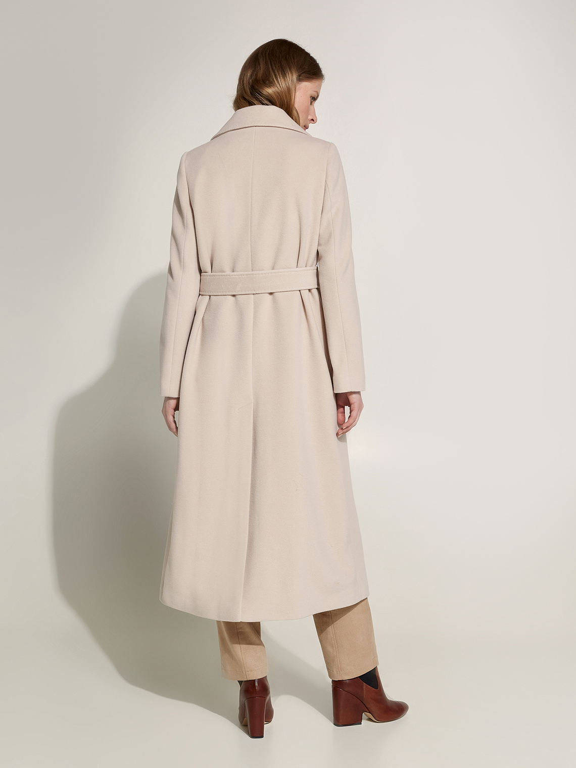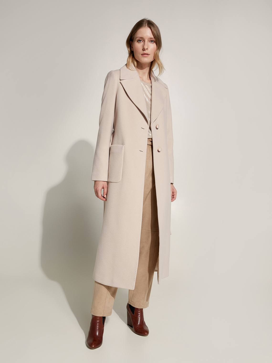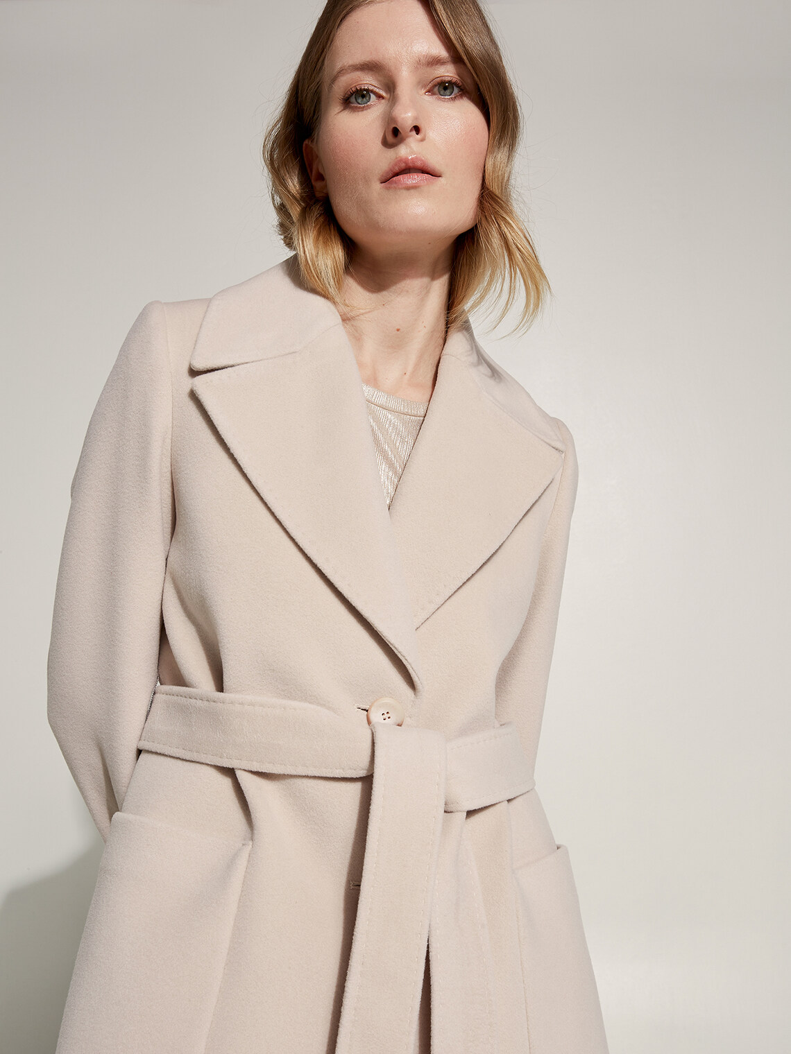 Cappotto in panno misto lana cashmere, fodera interna; abbottonatura monopetto con bottoni bicolor in tono con il tessuto; colletto a revers, tasche frontali applicate; cintura tono su tono da annodare a vita.