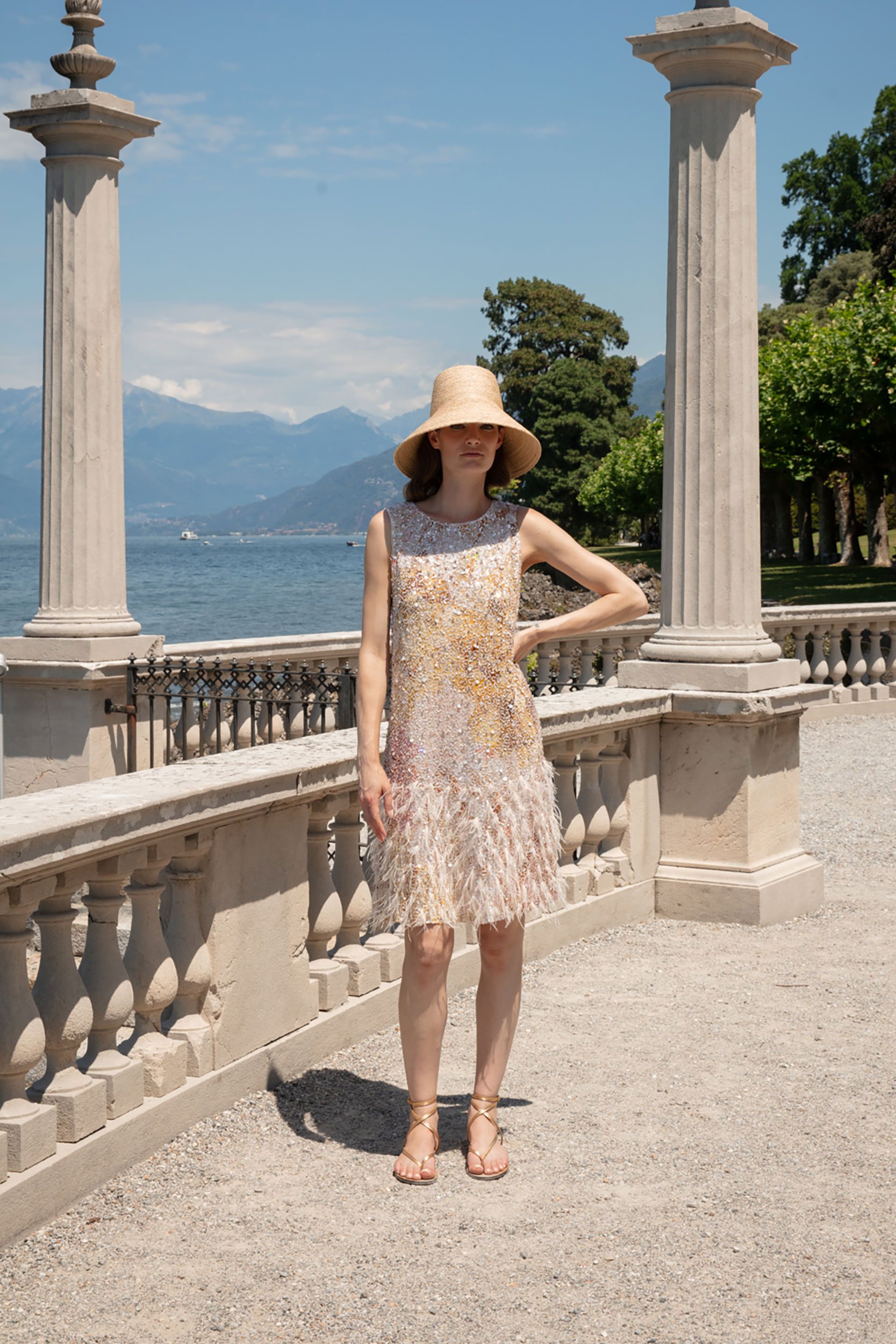 ABITO DIRITTO TEMPESTATO DI PAILLETTES STRASS E PIUME