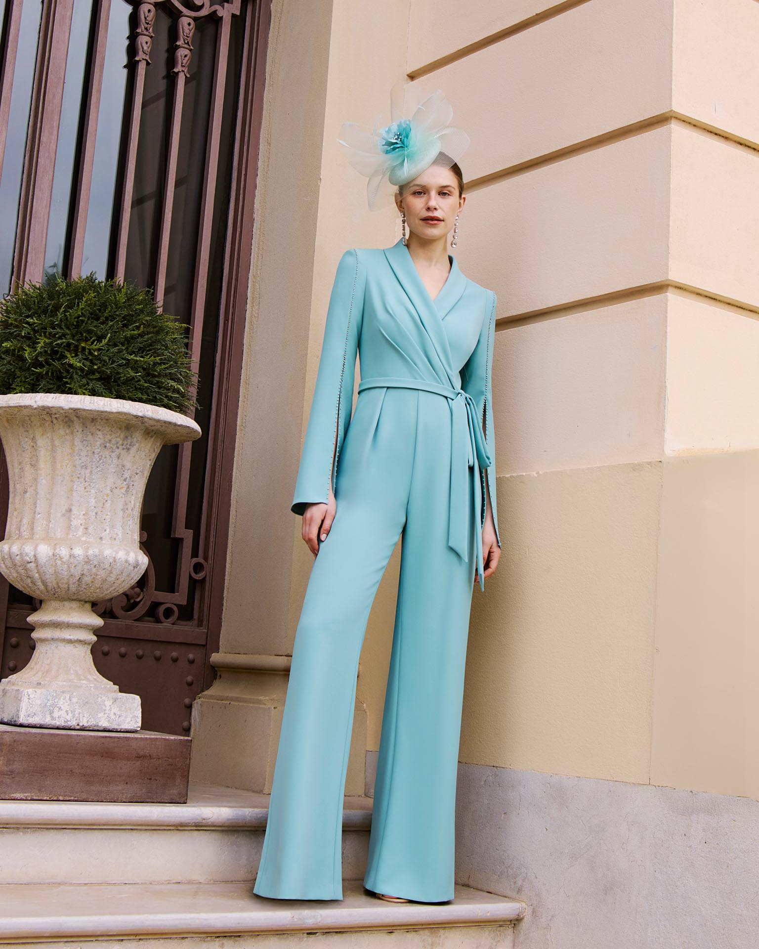 TUTA IN CREPE SCOLLO A V INCROCIATO MANICHE LUNGHE APERTE