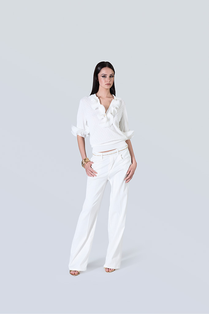 MAGLIA TRAFORATA SCOLLO A V MANICA 3/4 CON ROUCHES