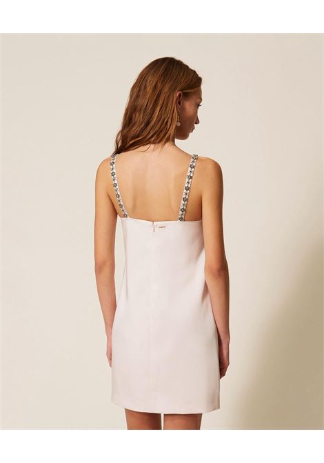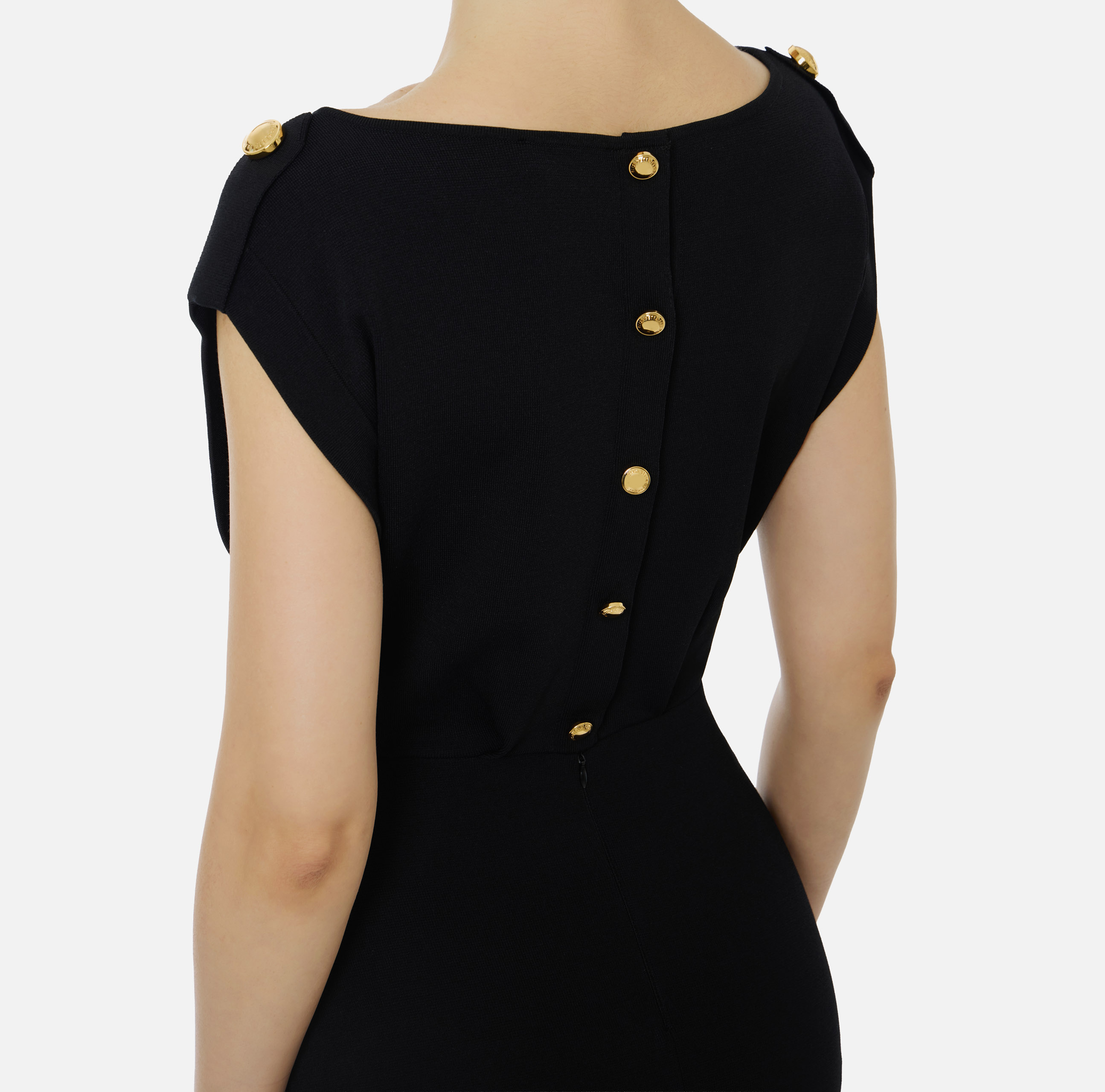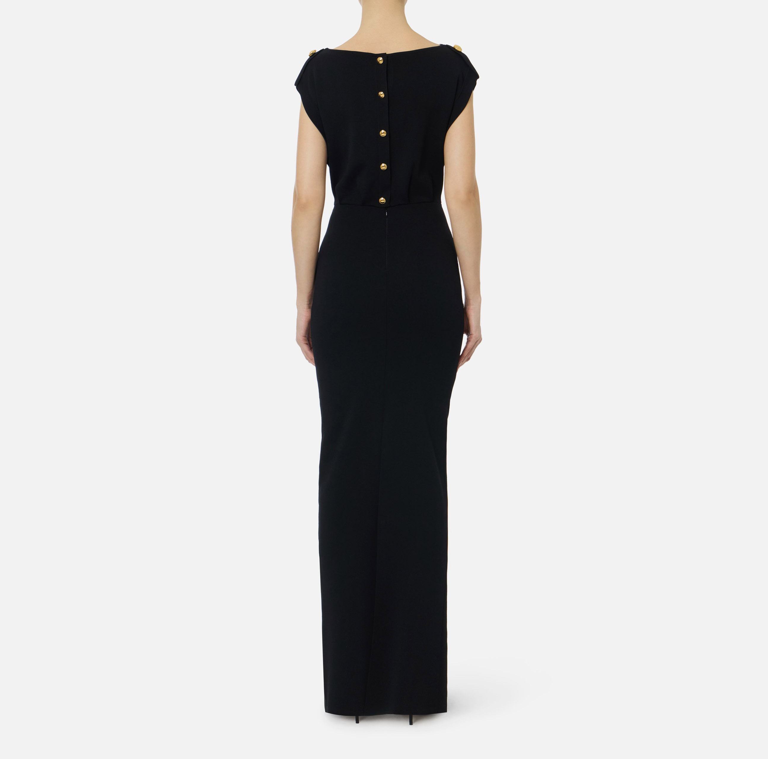 ABITO LUNGO SMANICATO LINEA DRITTA ARRICCHITA DA ALAMARI SULLE SPALLE APERTURA SULLA SCHIENA E SPACCO CENTRALE