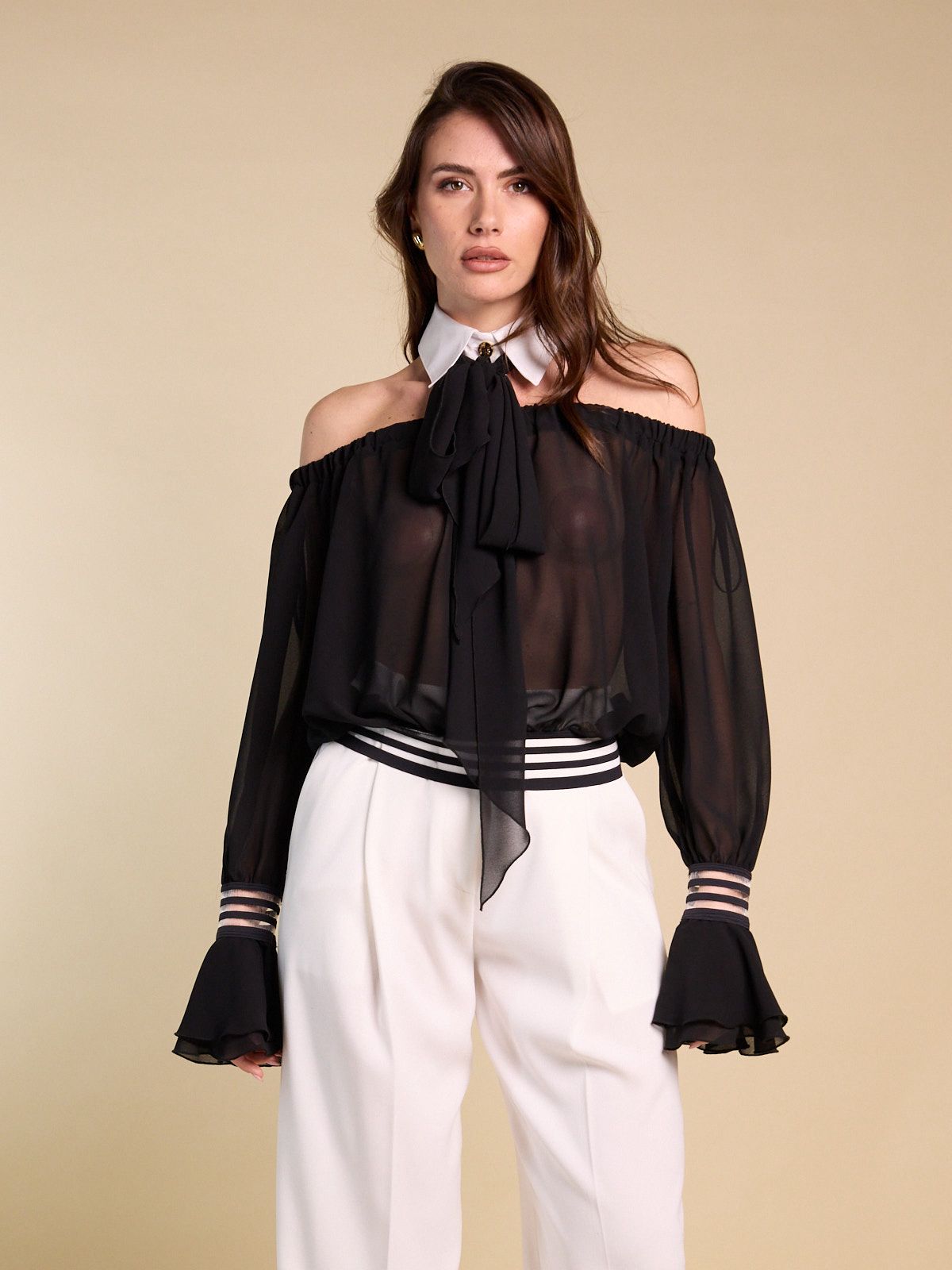 CAMICIA CROP INSERTI TRASPARENTI SCOLLO A BARCA CON COLLETTO E FUSCIACCA
