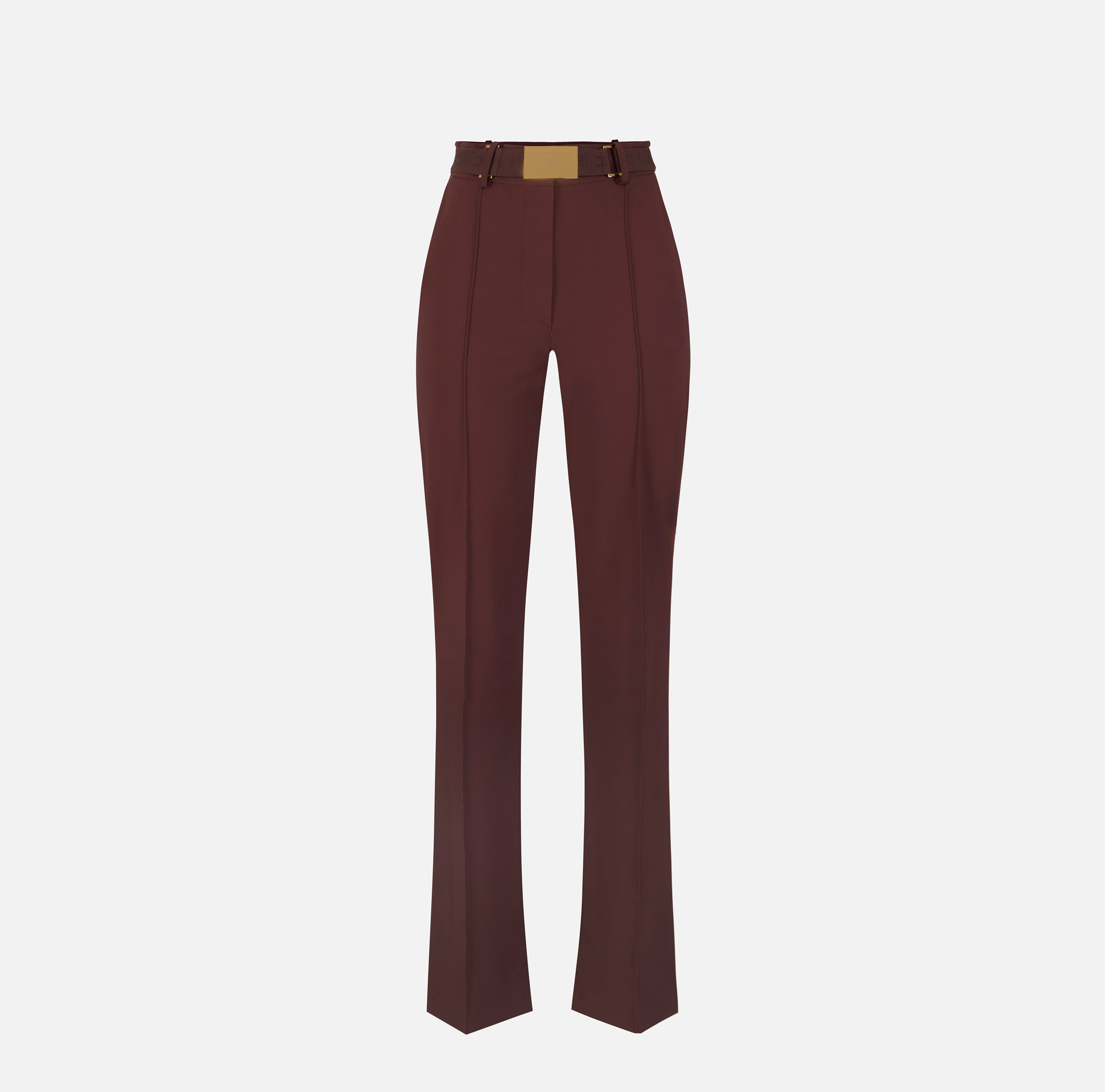 PANTALONE A ZAMPA IN TESSUTO TECNICO CON CUCITURA FRONTALE IMPREZIOSITO DA UNA CINTURA IN TELA CON PLACCA ORO LOGATA