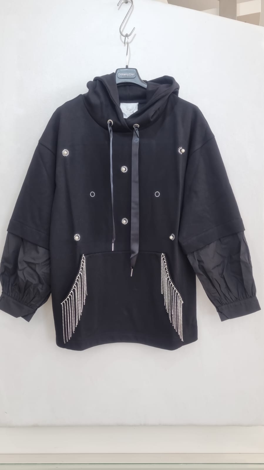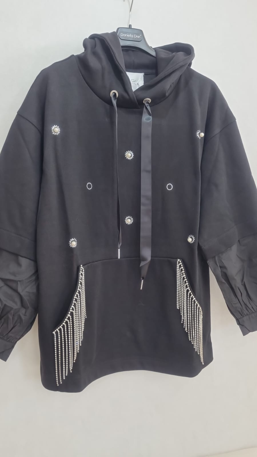 FELPONE CON CAPPUCCIO PIETRE STRASS E MANICA CAMICIA