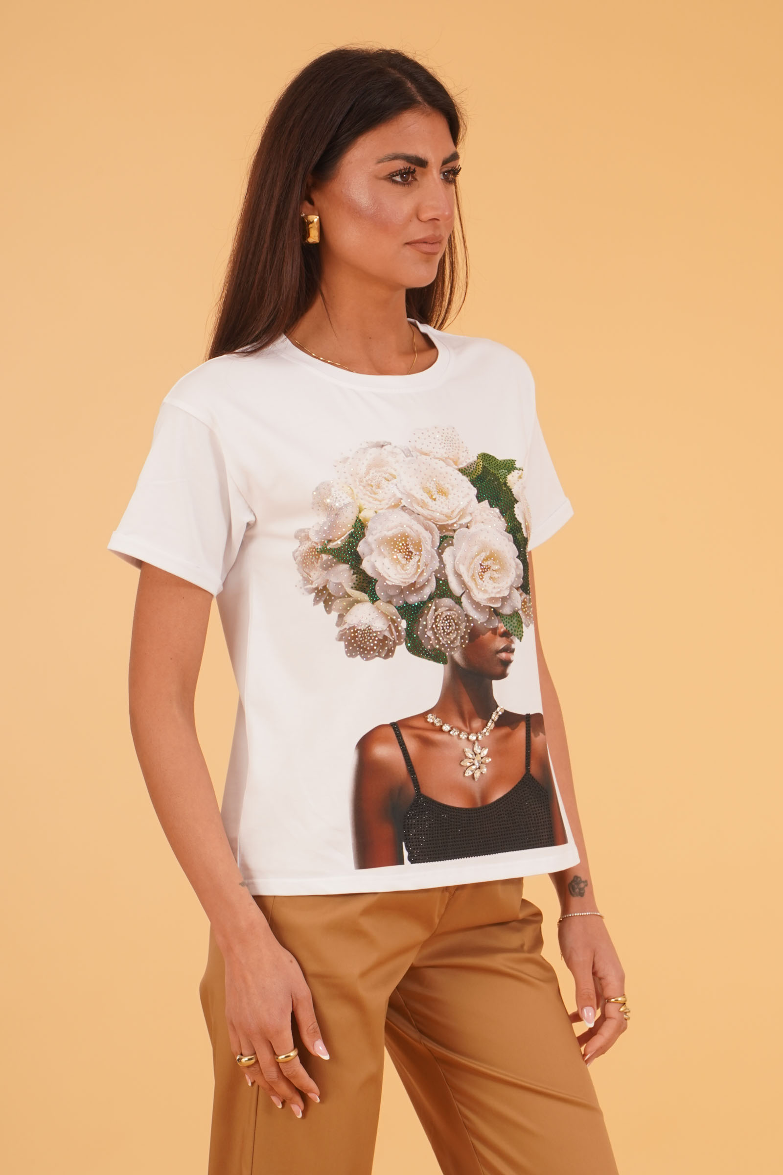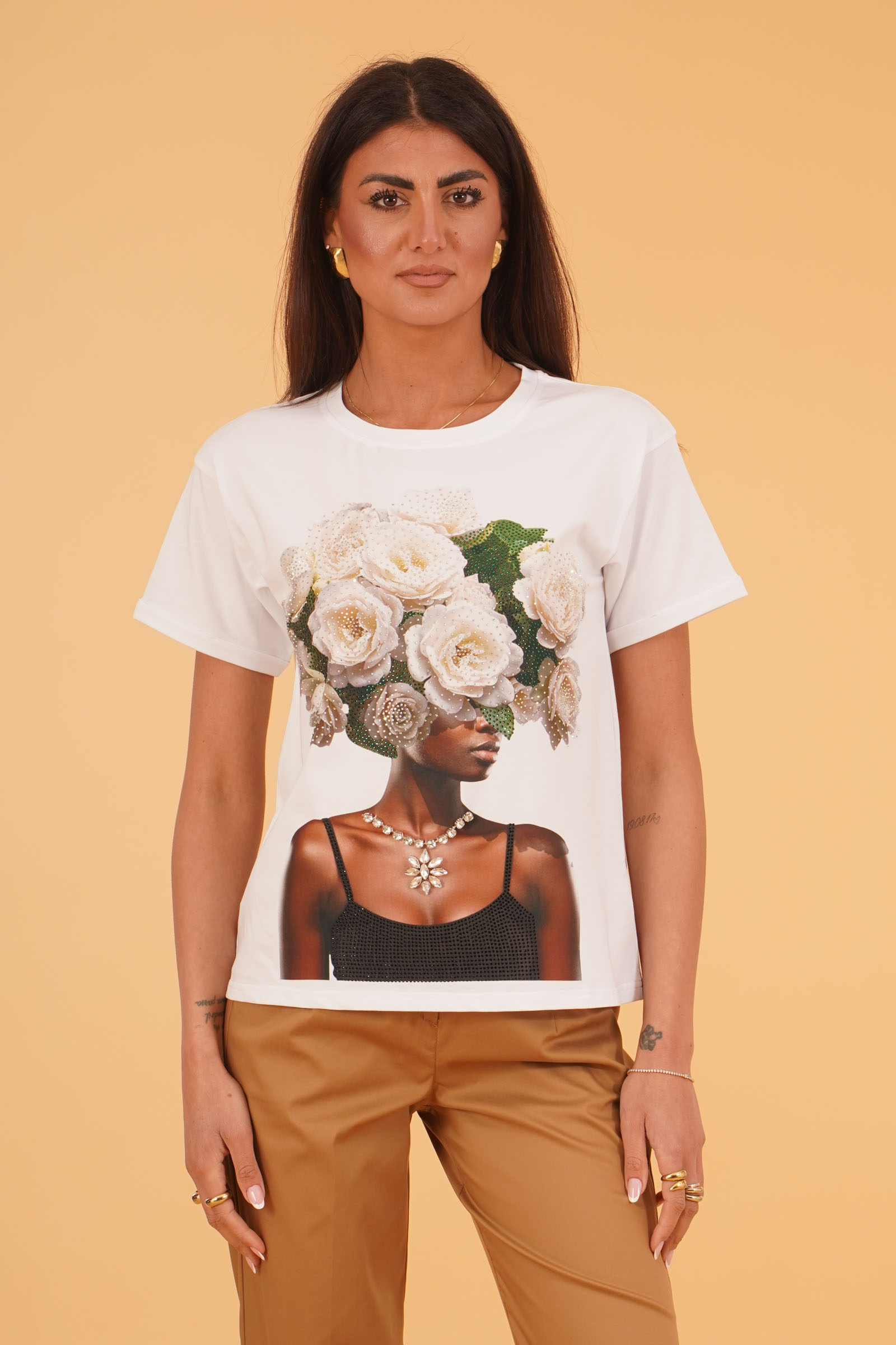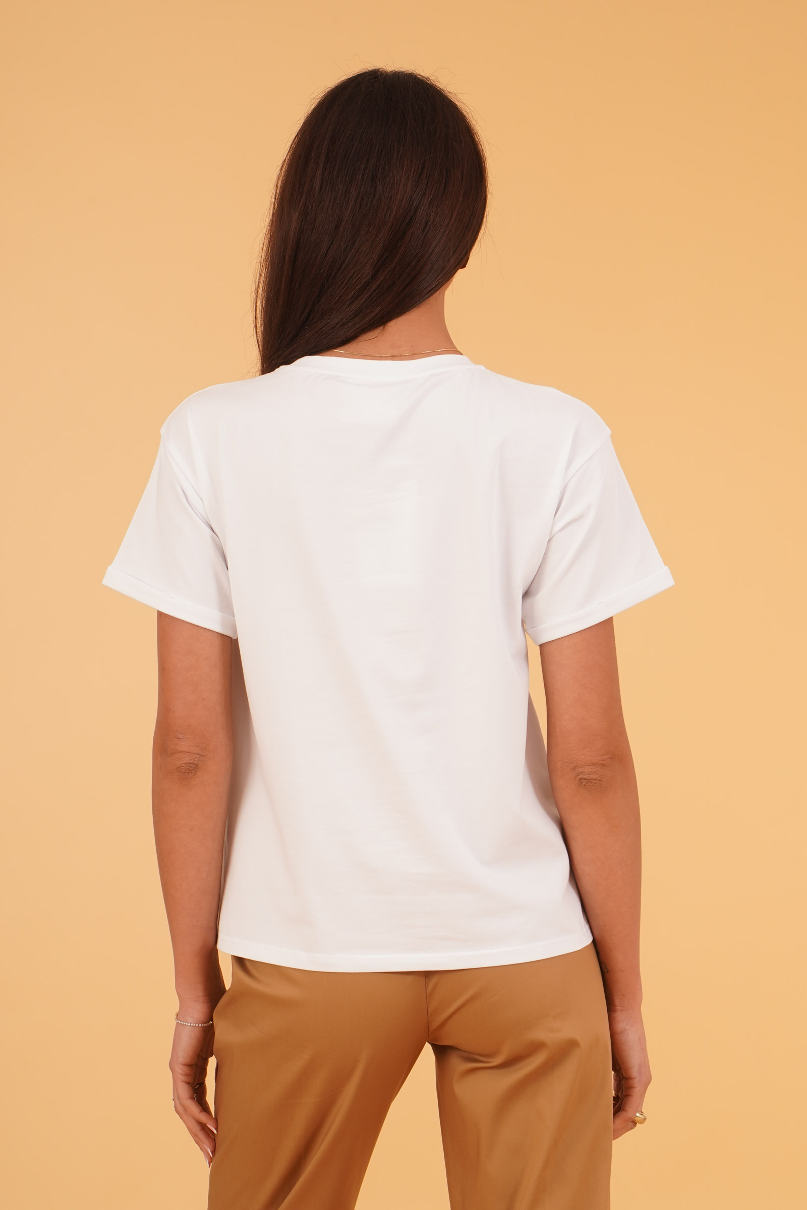 T-SHIRT SCOLLO A V CON FIOCCHI E CUORI STRASS