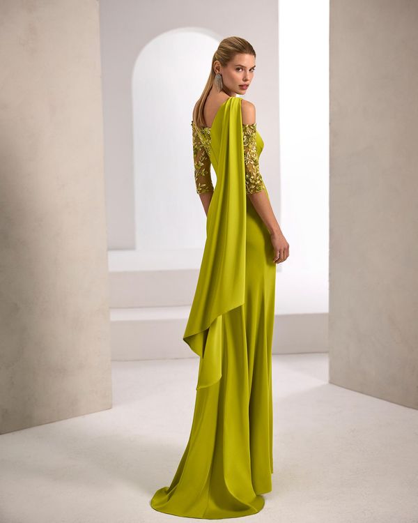 ABITO LUNGO IN CREPE SATINATO CORPETTO PREZIOSO SCOLLO A BARCA MANICA 3/4 AGGRAPPATURA IN VITA CON FUSCIACCA SULLA SPALLA