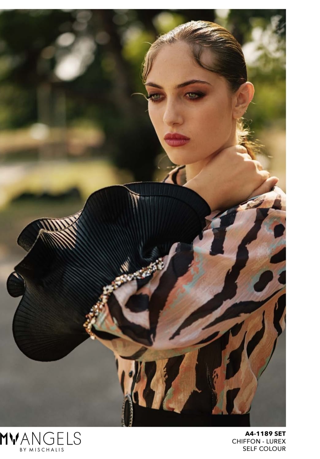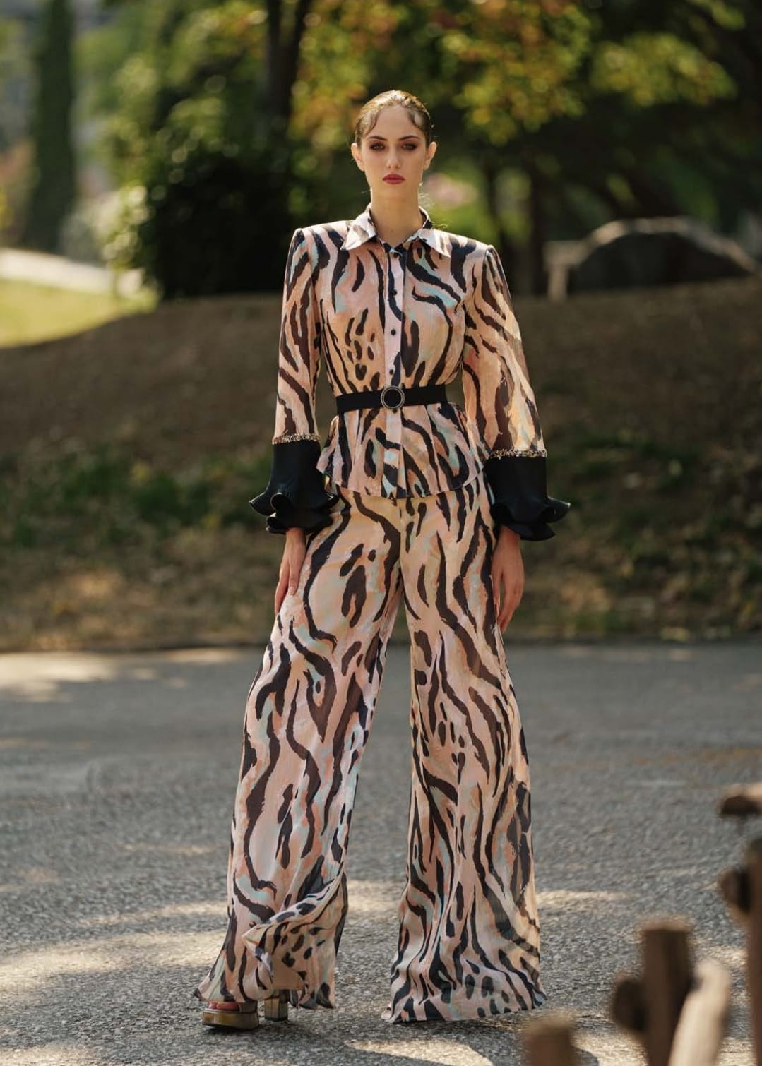 COMPLETO CAMICIA FANTASIA CON MANICA BORDO PLISSE E ROUCHES PANTALONE PALAZZO