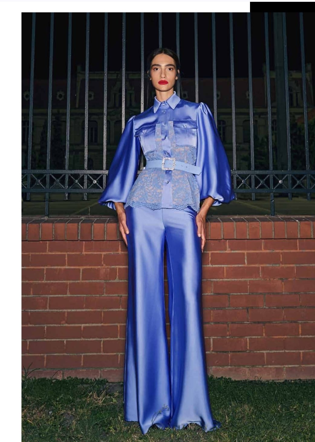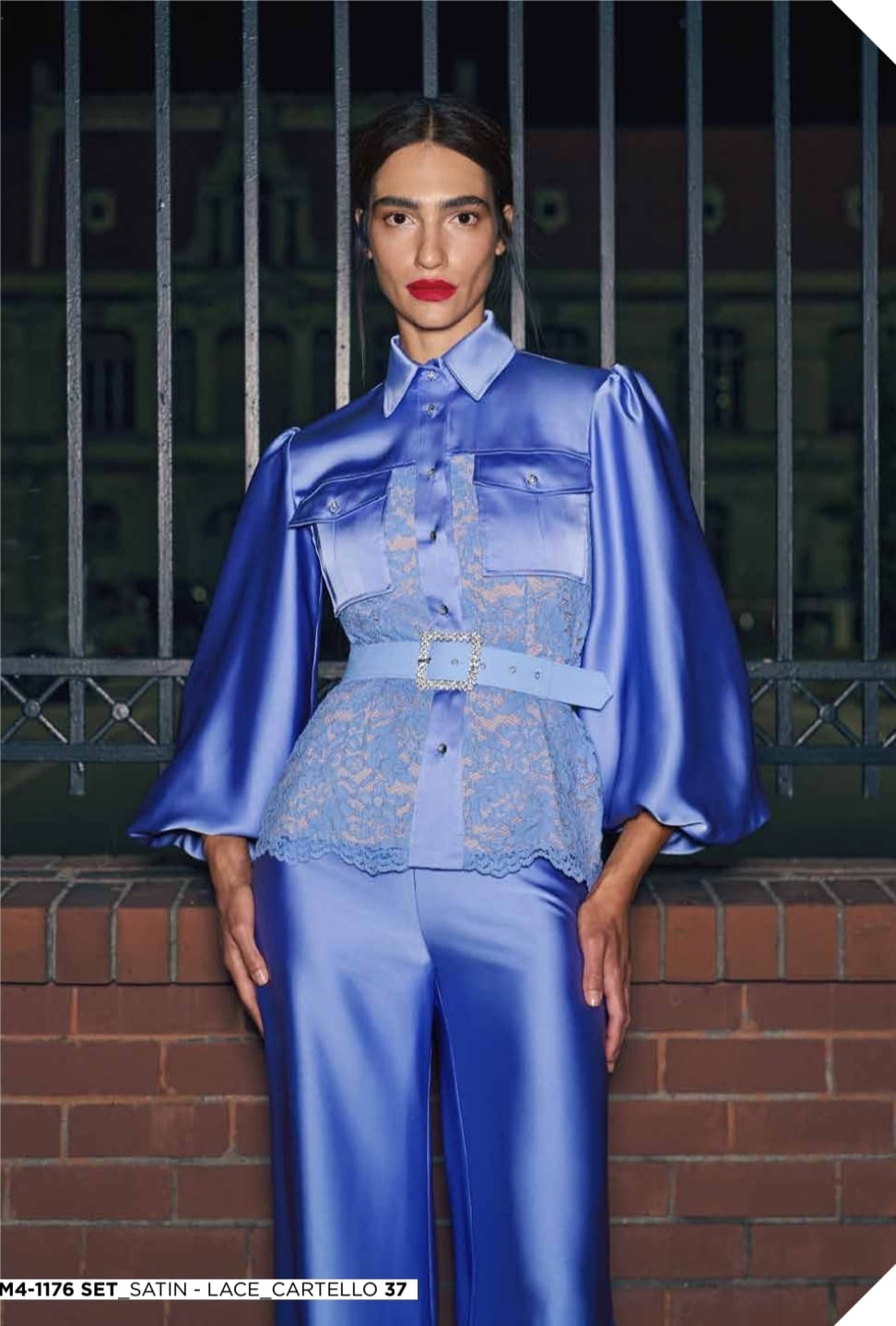 COMPLETO CAMICIA SATINATA CON PARTE IN PIZZO PANTALONE PALAZZO E CINTURA