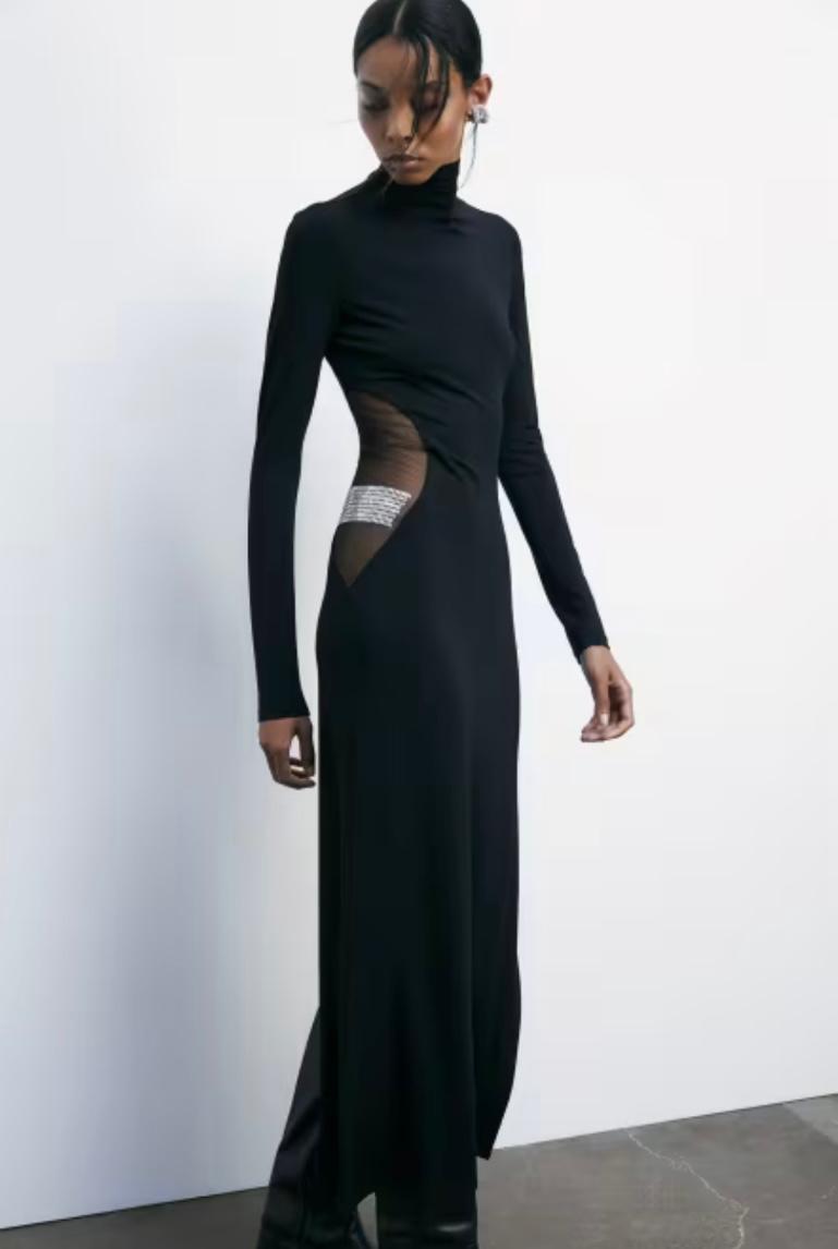 ABITO LUNGO COLLO ALTO CON DETTAGLIO VELATO E STRASS SUL FIANCO