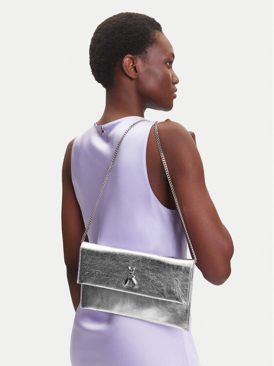 POCHETTE IN VITELLO LAMINATO LOGO FRONTALE E TRACOLLA CATENA REMOVIBILE