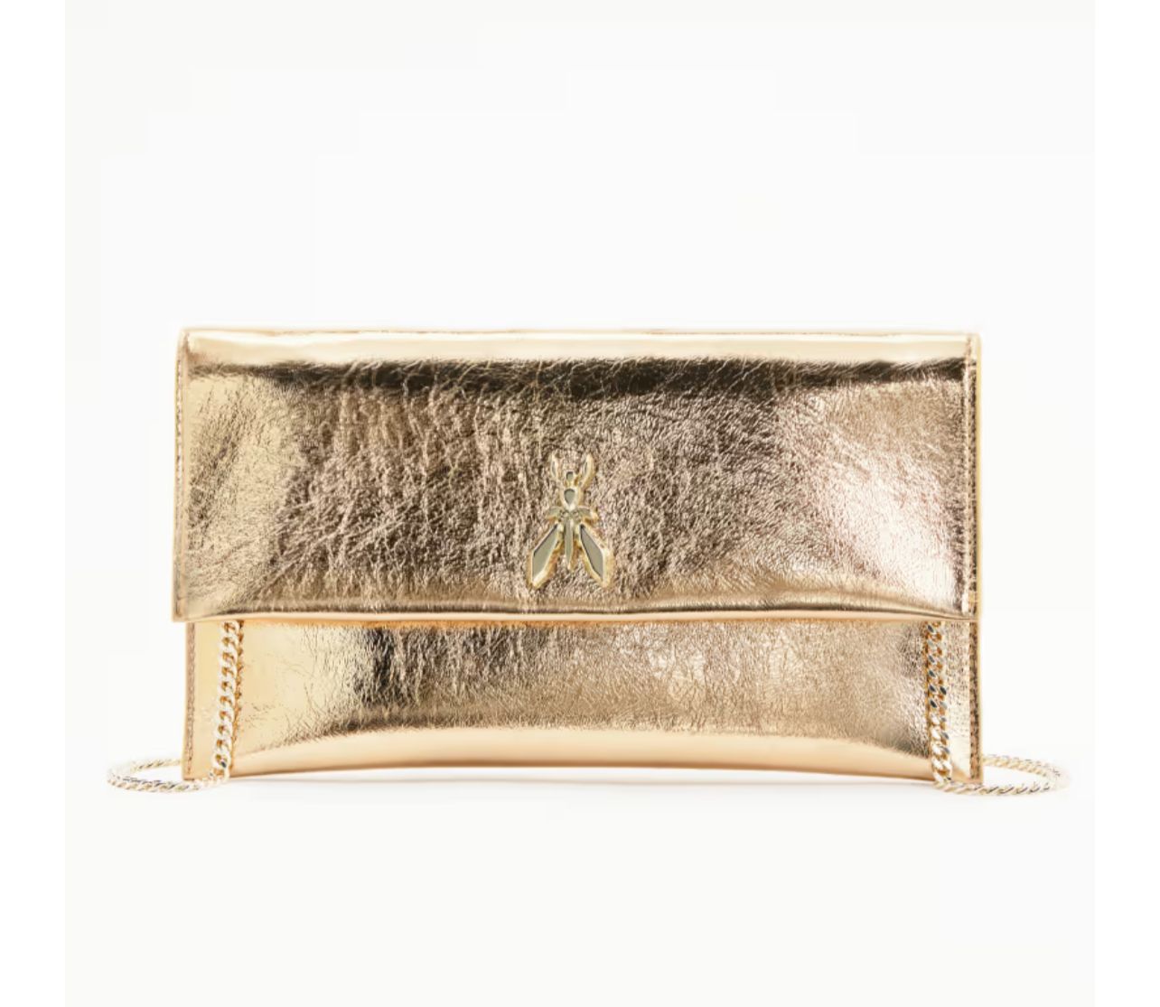 POCHETTE IN VITELLO LAMINATO LOGO FRONTALE E TRACOLLA CATENA REMOVIBILE