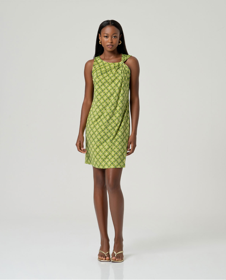 ABITO CORTO IN JERSEY CON NODO AL COLLO STAMPA GEOMETRICA