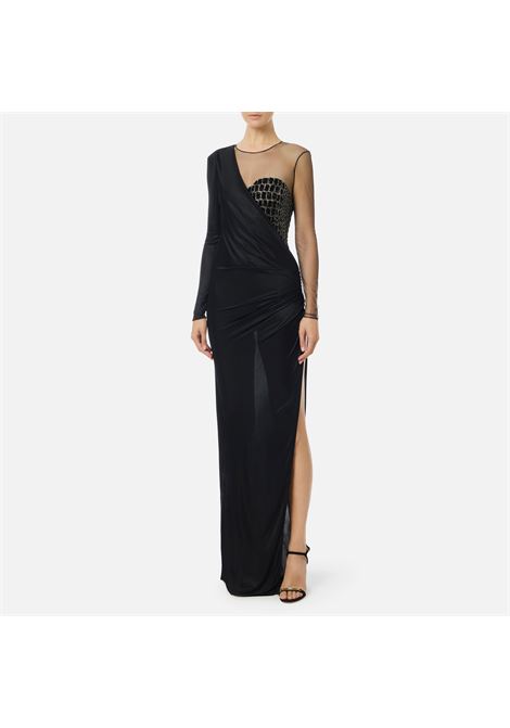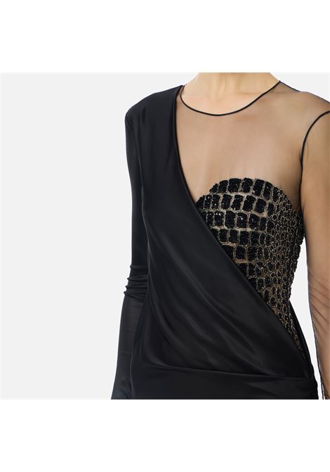 ABITO LUNGO IN JERSEY E TULLE CON DRAPPEGGIO LATERALE E CORPETTO PIETRE