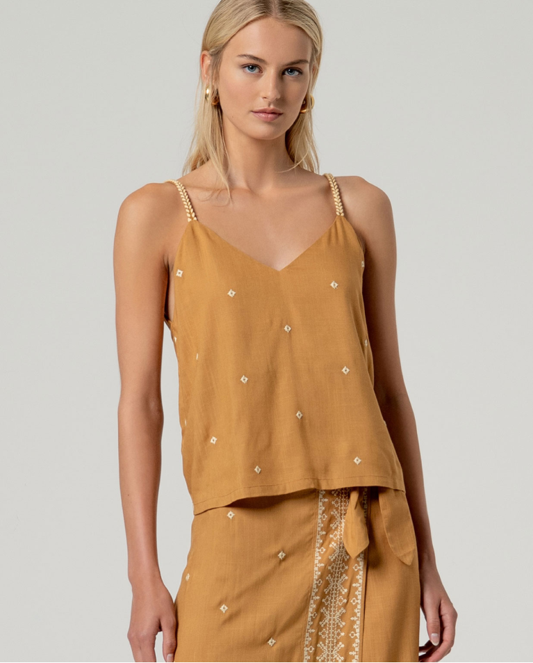 TOP SCOLLO A V CON MICRO VOLANT E RICAMO GEOMETRICO VERTICALE