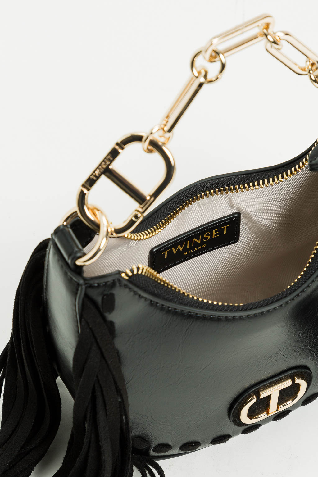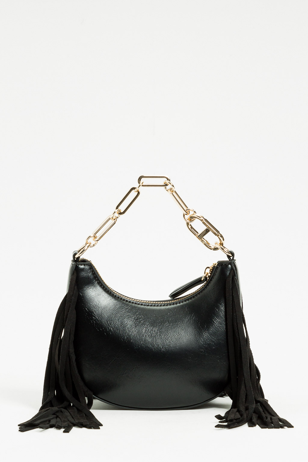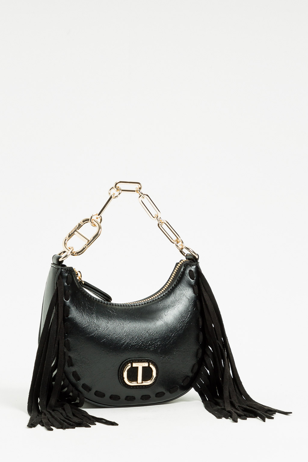 BORSA A SPALLA CON FRANGE CATENA E LOGO ORO