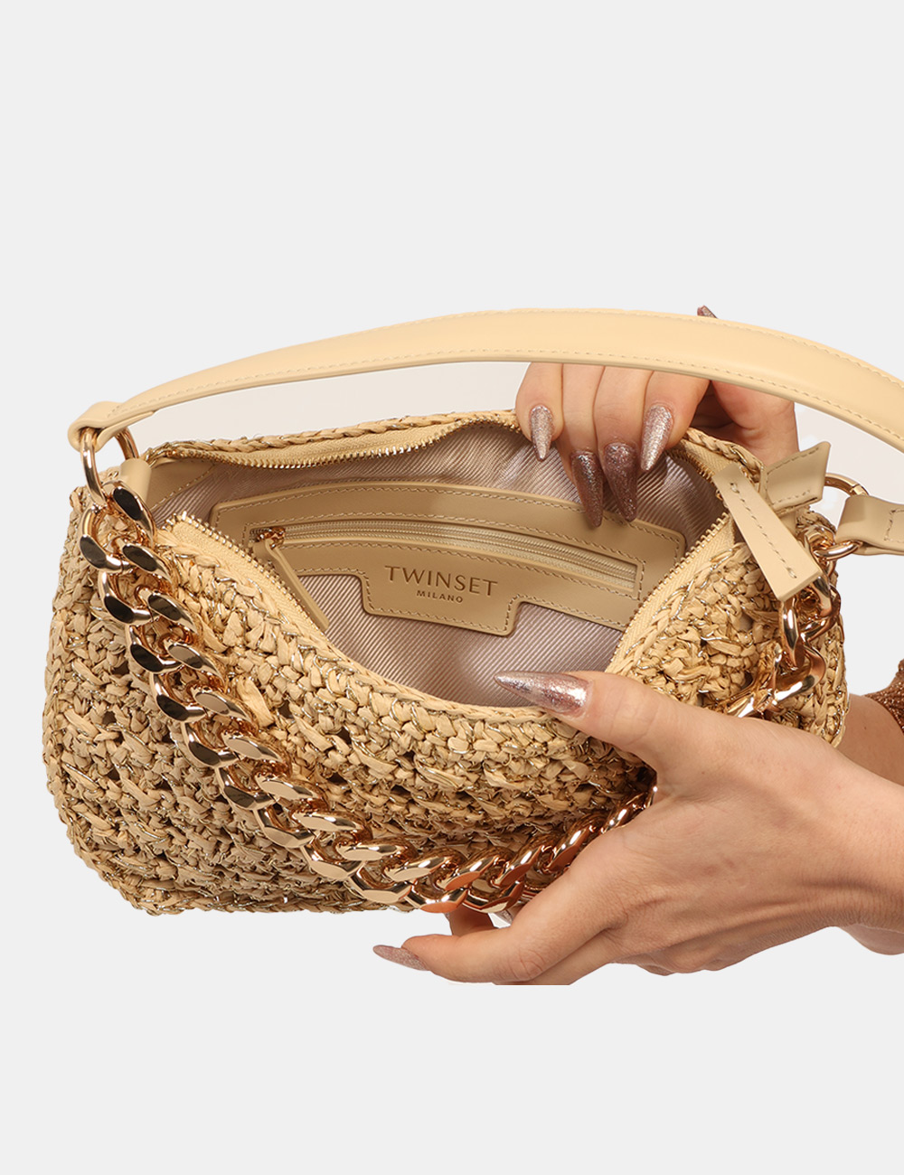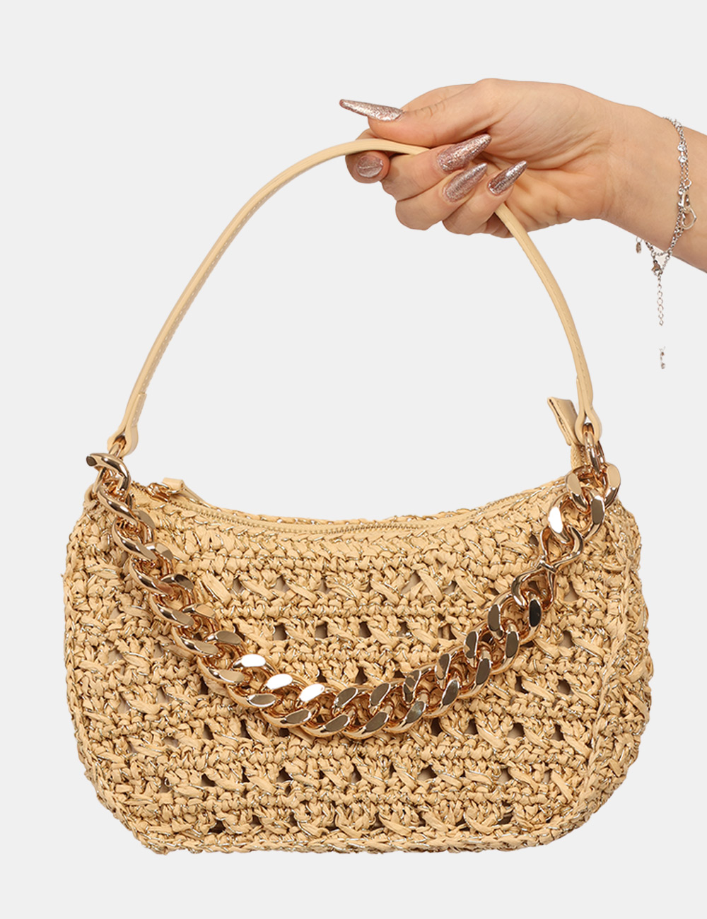 BORSA A SPALLA IN RAFIA CON CATENA ORO