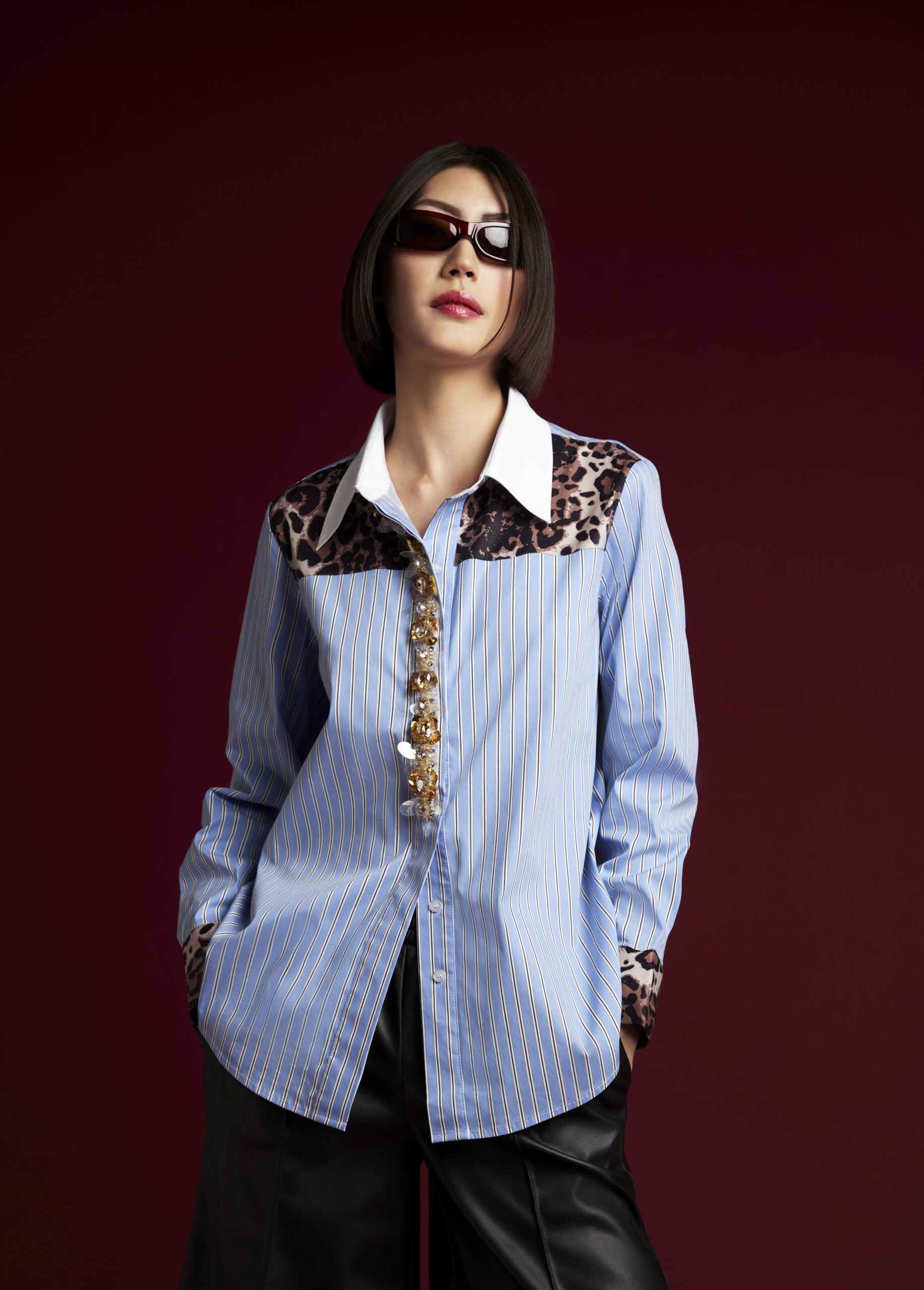 CAMICIA A RIGHE LEOPARDATA CON PIETRE PREZIOSE