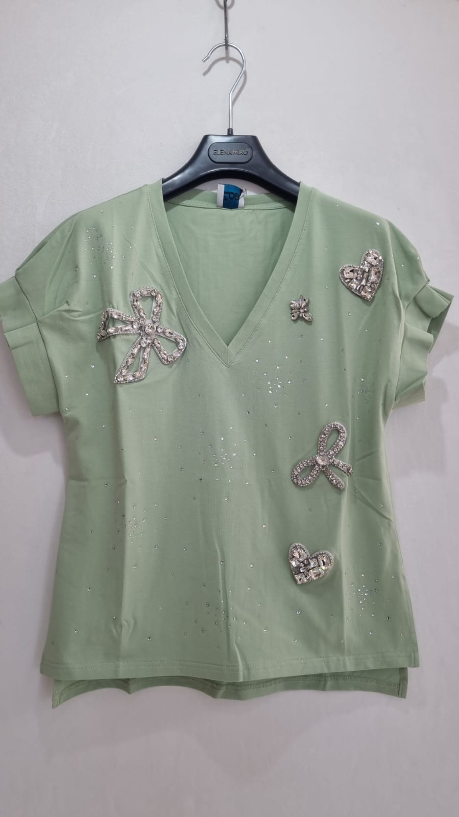 T-SHIRT SCOLLO A V CON FIOCCHI E CUORI STRASS