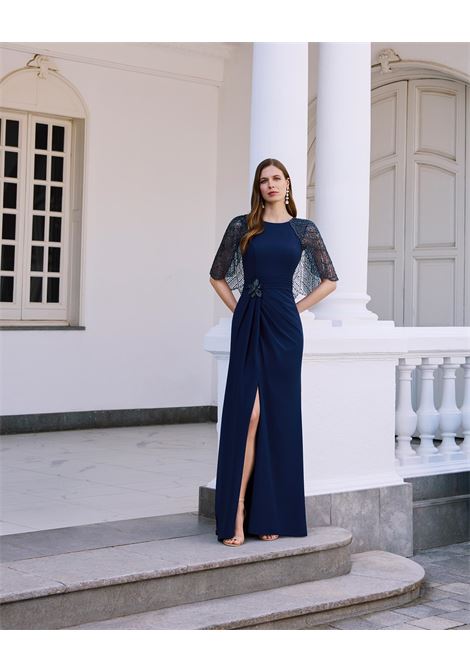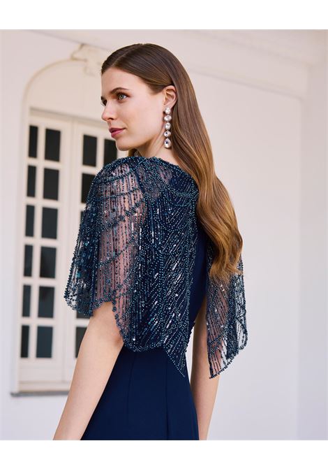 ABITO LUNGO IN CREPE ELASTICIZZATO MANTELLINA RICAMATA CON PERLINE