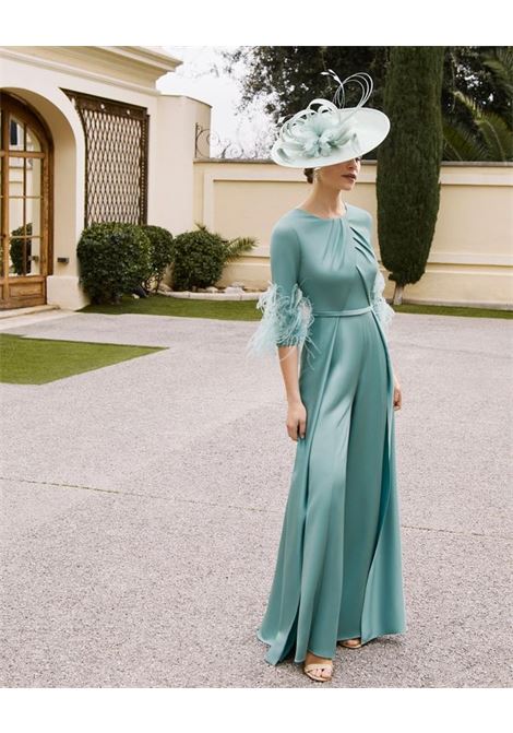ABITO TUTA MANICA 3/4 CON PIUME E STRASS SCOLLO A V AVANTI E SULLA SCHIENA
