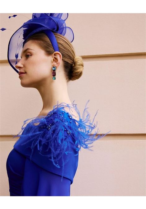 ABITO MIDI SCOLLO A BARCA CON PIUME E PERLINE MANICA VELATA APERTA