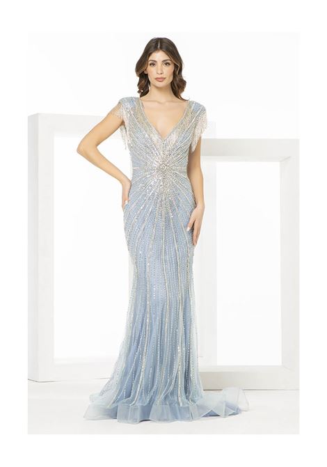 ABITO LUNGO SCOLLO A V CON DIADEMA CENTRALE RICOPERTO DI CORALLINI E STRASS