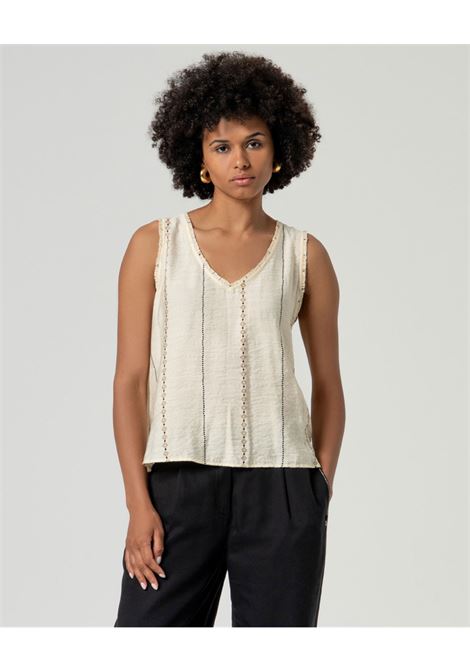 TOP SCOLLO A V CON MICRO VOLANT E RICAMO GEOMETRICO VERTICALE