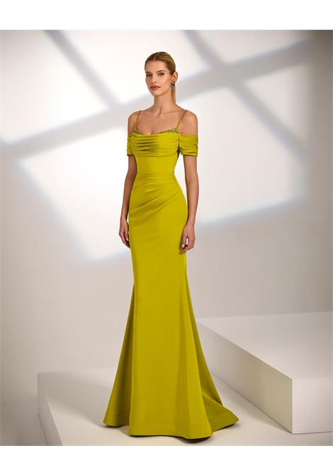 ABITO LUNGO IN CREPE SATEN MODELLO AVVOLGENTE CON SPALLINE DI PIERLINE E MANICA DRAPPEGGIATA