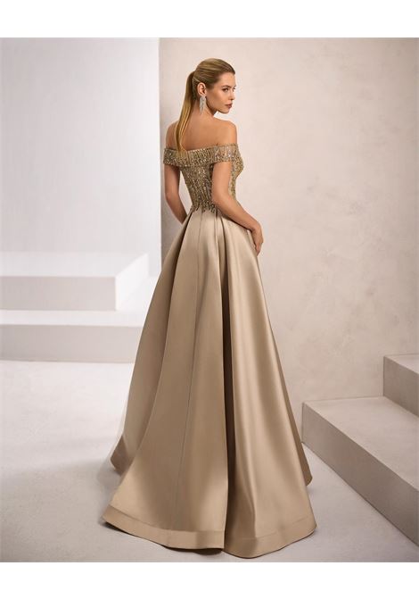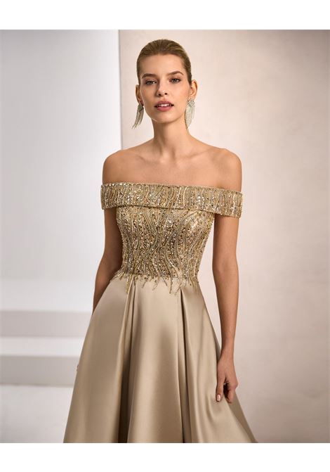 ABITO LUNGO IN MIKADO CORPETTO PREZIOSO SCOLLO A BARCA CON PERLINE